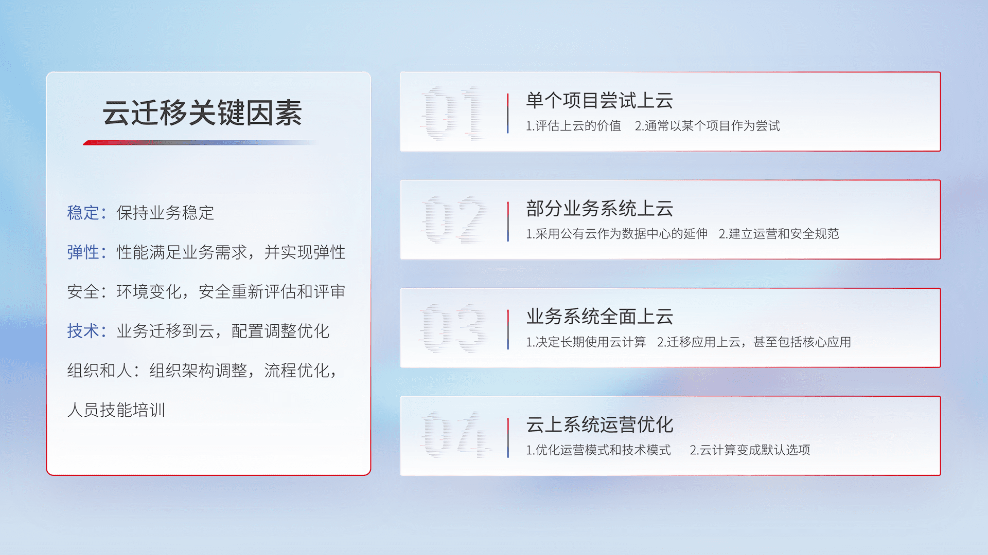 结合实际业务,,,从规划设计、、云平台选型、、、、云原生改造、、、、数据迁移、、、集成交付,,迁移全过程为客户识别最佳上云路径,,,做好风险识别管理,,,设计网络架构、、身份权限、、安全审计合规、、操作审计、、、日志审计、、监控告警策略、、、、多站点容灾设计等,,,对云上基础设施进行整体规划,,,,提升IT治理水平,,以满足弹性、、高可用、、高性能的需求。。。